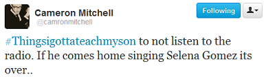 Hoje (11), enquanto a tag #ThingsIGottaTeachMySon (em português, “coisas que irei ensinar ao meu filho”) estava rolando pelo Twitter, Cameron Mitchell, ex participante do reality show “The Glee Project”, fez um comentário o qual não agradou aos fãs da Selena Gomez, causando intriga e tumulto na rede. Confira: