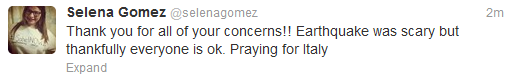 Após seu agente Nick Styne, avisar que Selena estava bem, foi a vez dela acalmar nós fãs, após um terremoto de magnitude 5.8 atingir a cidade em que Selena e sua equipe estavam. Leia abaixo o que ela teve a dizer: